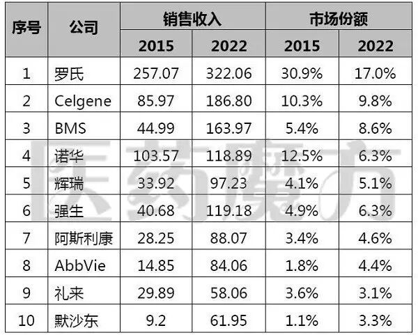 根据市场份额的变化,我们很容易就能看出一家药企研发重心的变化。那么,导致这些药企市场份额发生变化的驱动力(核心产品)是什么?您看一下今年上半年的药品全球销售额数据就明白了(见:全球TOP10药企2016上半年成绩单)。