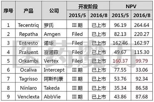 从研发角度,EvaluatePharma采用净现值法(NPV)对全球在研新药的市场潜力进行了评估。关于净现值,大家可以通俗理解成“处于某个研发阶段的新药资产值多少钱”。因此,下表便是截至2016年8月全球最值钱的20个在研新药。
