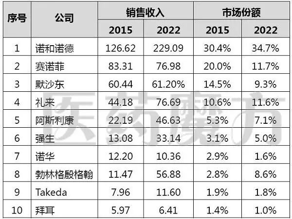 比如在肿瘤领域,罗氏虽然在2022年仍将是肿瘤领域的老大,但市场份额将从2015年的30.9%下降到2022年的17.0%。在糖尿病领域,诺和诺德的市场份额将从30.4%增长至34.7%。在抗病毒药物领域,虽然GSK的市场份额增长明显,但老大Gilead的份额下降得其实并不多,正如我们之前分析的:GSK决斗Gilead:谁才是全球艾滋病药物市场真老大?。