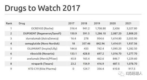 E药经理人汇聚各类消息发现,以下9个品种是整个2017年最具看点的品种,其将会以技术力量带动全球医药增长,而药审改革的提速,这些产品将会以更快的速度杀入国内市场。就目前的情况而言,“药物观察报告”预计的总收益将达到160亿美元。
