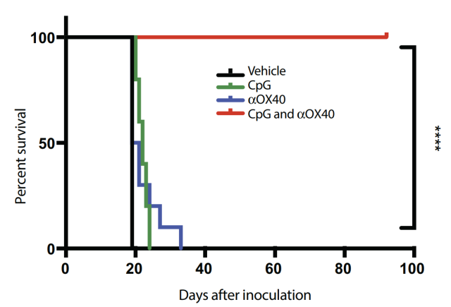 联合注射CpG和OX40的小鼠全部存活(红色)