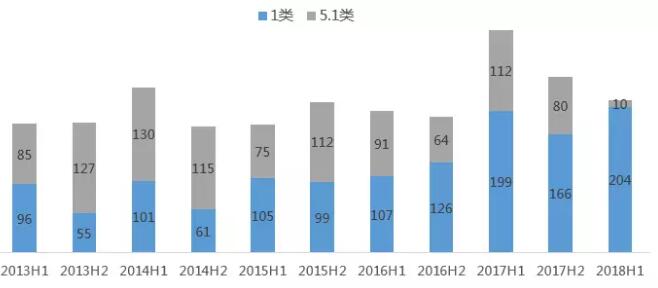 备注:1)补充申请,复审和进口再注册不包含在分析范围内;2)统计时间范围为承办时间2013年01月01日-2018年06月30日;3)化药1类+5.1类(注册分类2016版)