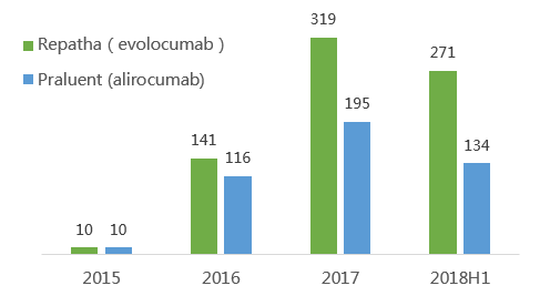全球已上市PCSK9抑制剂销售额(百万美元)