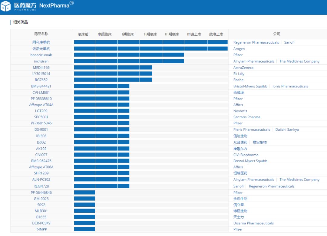 医药魔方全球新药库显示,目前全球共有31款针对PCSK9靶点的药品,其中已上市2款,III期临床2款,II期临床3款,I期临床17款,临床前7款。