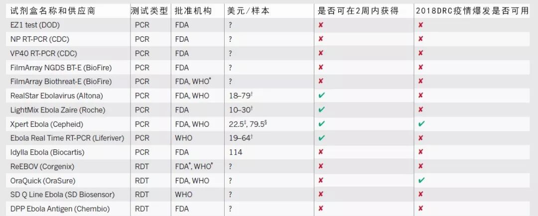 DOD,US Department of Defense,美国国防部;DRC,Democratic Republic of the Congo,刚果民主共和国;RDT,rapid diagnostic test,快速诊断测试;* 表示在 2018 年被除名的测试;†表示测试 20 个样品(批量)或每次测试 1 个样品时的估计成本,不包括 RNA 提取成本;‡表示高负担发展中国家使用该试剂的成本; § 表示美国和欧洲国家使用该试剂的成本。