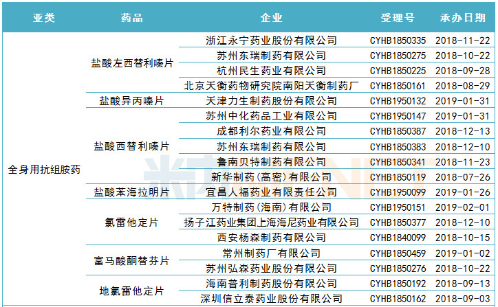 目前,国内有10家企业拥有盐酸左西替利嗪片的生产批文,永宁药业、东瑞制药、民生药业、天衡制药等4家企业正在申报该产品的一致性评价。