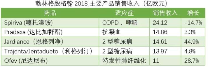 从具体上市产品上看,用于COPD和哮喘的经典药物Spiriva(噻托溴铵)由于遭遇到较大的价格压力而下滑,不过目前仍还是勃林格殷格翰最畅销的产品。抗凝药Pradaxa(达比加群酯)和DPP-4类降糖药Trajenta基本保持稳定。
