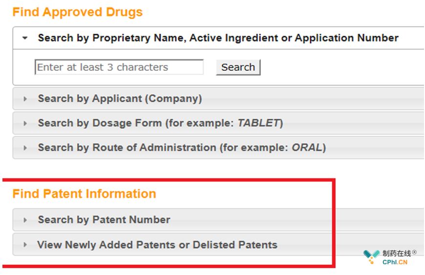 例如下面是美国FDA的OB(橙皮书)检索途径,可以看到下面和专利相关的检索入口。但是国内目前还没有建立如此便捷的专利链接制度。