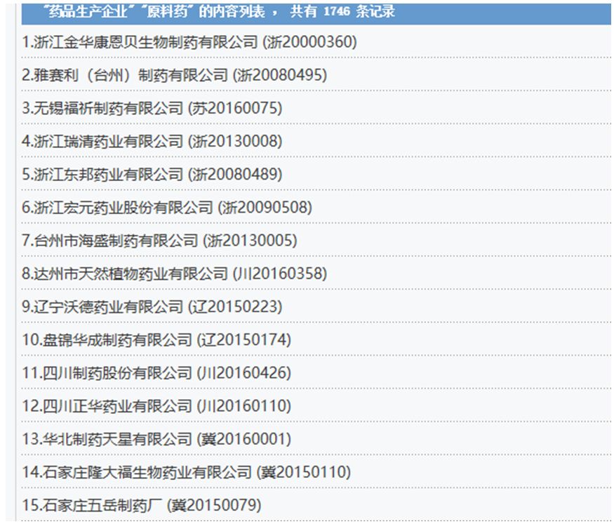在过去很长一段时间,美国FDA没有建立针对进入美国市场的API供应商的数据库,因此发生了2008年的肝素钠事件。现在FDA通过中美贸易谈判结果,就可以分享中国药政部门对于国内API供应商的规范管理结果,也算了行政资源。下面截图是来自NMPA数据库的检索数据。目前看是有1746家API供应商,但是考虑到还有很多采用关联登记的API供应商还没有取得生产许可证,实际上API供应商企业会更多一些。