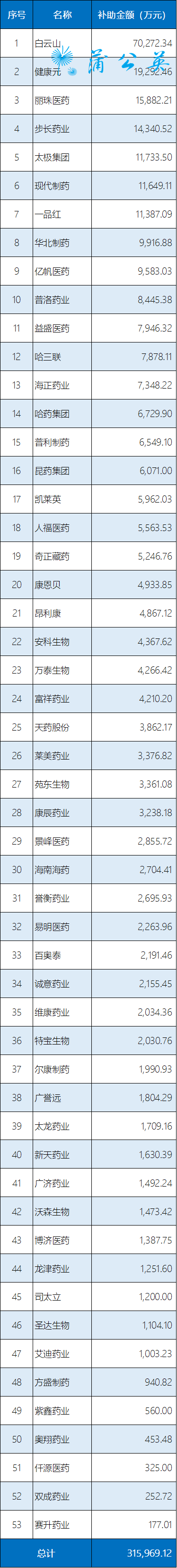 第11-20名依次为益盛医药、哈三联、海正药业、哈药集团、普利制药、昆药集团、凯莱英、人福医药、奇正藏药、康恩贝。第21-53名的企业名单和补助金额详见下面的表格。