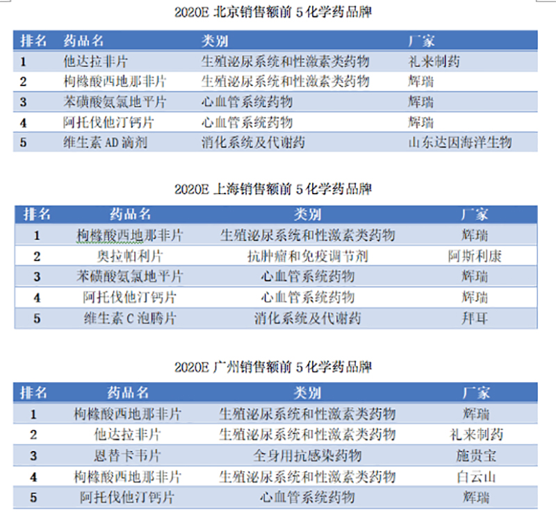 从化学药销售数据来看,2020年,西地那非、阿托伐他汀钙片、他达拉非片等药物在北上广等城市依旧销售火爆。