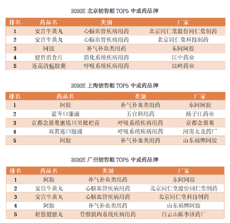 在中成药方面,无论是北京、上海,还是广州,阿胶都榜上有名。