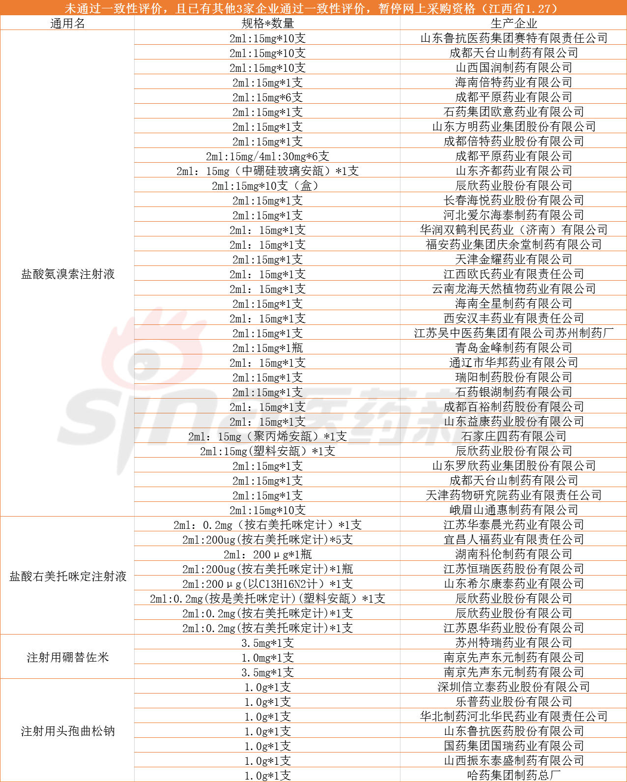 其中过评数量最多的盐酸氨溴索注射液,有33家企业被暂停在江西省挂网采购,涉及企业包括罗欣、石药欧意、成都倍特、长春海悦、瑞阳制药、吴中医药苏州制药厂、成都百裕、石家庄四药等。
