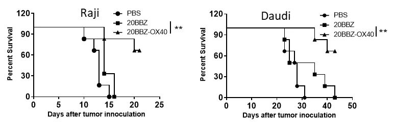 研究人员检测了20BBZ-OX40 CAR-T细胞在人的B细胞来源的Raji和Daudi白血病模型中的治疗效果。发现相比于传统的20BBZ-CAR-T细胞,20BBZ-OX40 CAR-T细胞治疗后白血病肿瘤荷载小鼠的存活时间延长。这与20BBZ-OX40 CAR-T细胞在体内的更好扩增是密切相关的。