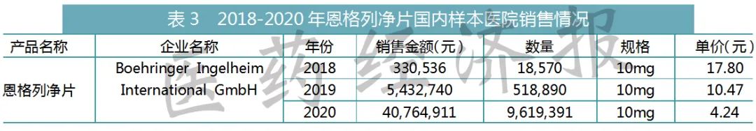 恩格列净片进入2019版医保目录,新价格2020年1月起实施。据PDB数据库数据:与2019年相比,2020年勃林格殷格翰的10mg恩格列净片销售量同比增17.54倍,销售额同比增6.50倍,销售大幅增长,而2020年的单价(4.24元)仅为2019年的4折。