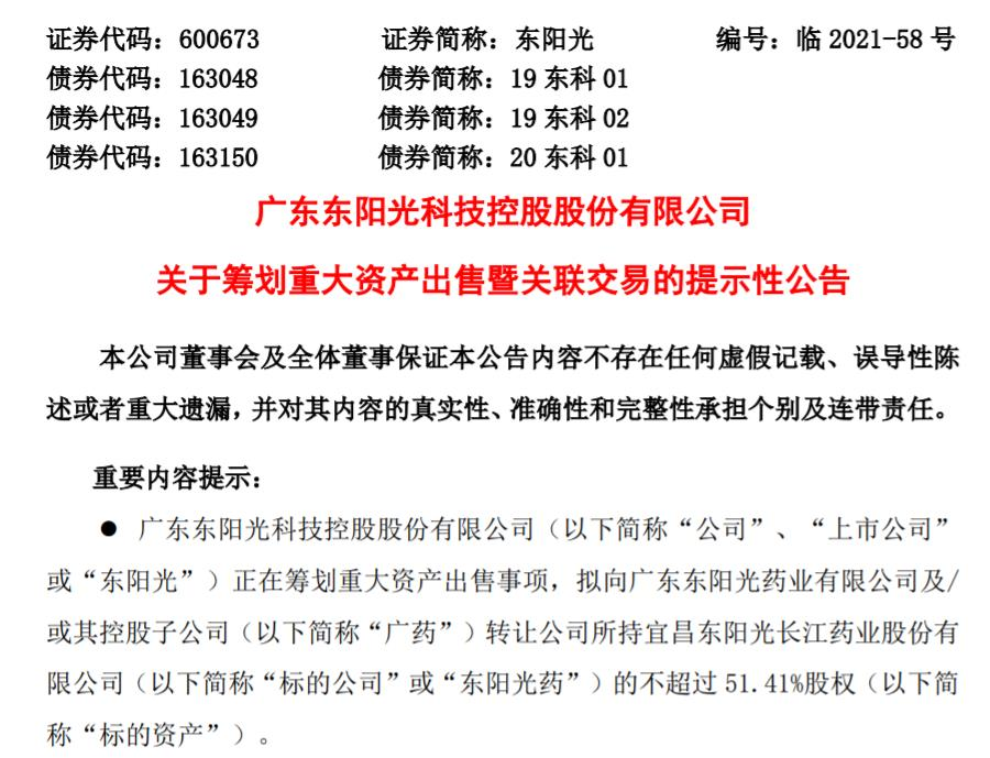8月31日,广东东阳光科技控股股份有限公司(简称“东阳光”)发布公告称,公司正在筹划重大资产出售事项,拟向广东东阳光药业有限公司及/或其控股子公司(简称“广药”)转让公司所持宜昌东阳光长江药业股份有限公司(简称“东阳光药”)的不超过4.5亿(占51.41%)股权。