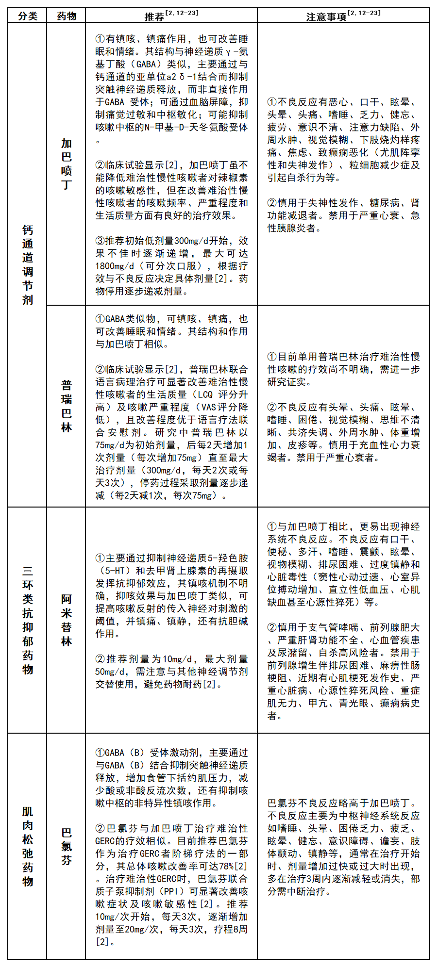 神经调节剂如钙通道调节剂加巴喷丁、普瑞巴林,三环类抗抑郁药物阿米替林及肌肉松弛药物巴氯芬,对治疗难治性慢性咳嗽有一定疗效,建议使用神经调节剂治疗难治性慢性咳嗽 [2,12-16]。