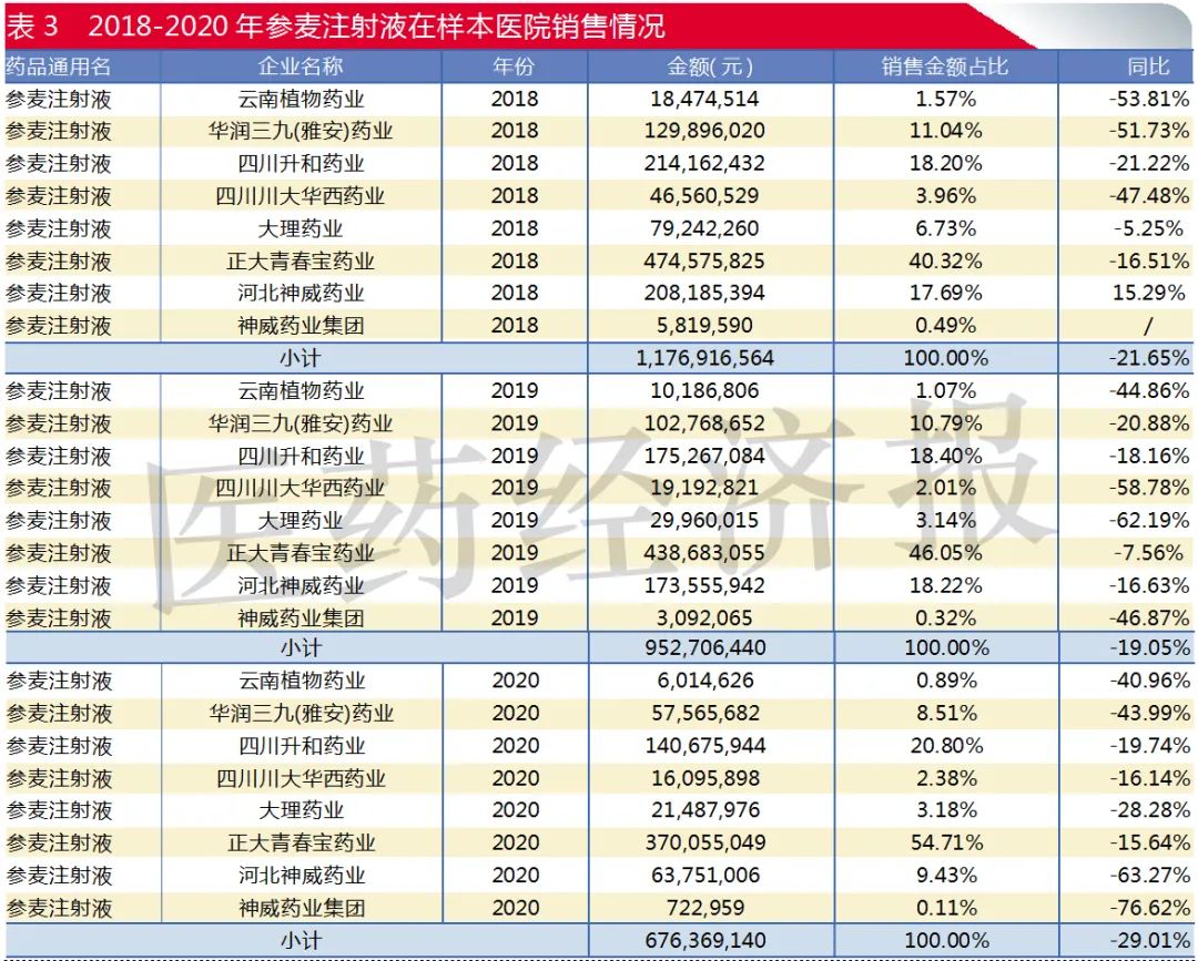 从表3可以看出,正大青春宝的参麦注射液销售额在2020年占比最大,达54.71%;而四川升和药业的占比为20.80%,排第2;河北神威、华润三九(雅安)和大理药业排在第3~5位。参麦注射液为国家医保目录甲类,笔者预测:如果纳入集采,排名后面的几家可能以更低的价格大幅提升占有率,医院总销售额将会进一步萎缩。