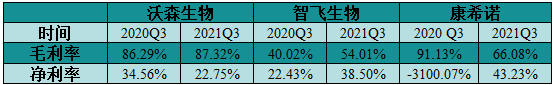 从三季报财务数据来看,康希诺前三季度毛利率达到66.08%,净利率达到43.23%;智飞生物前三季度毛利率达到54.01%,净利率达到38.5%,毛利率和净利率较2020年大幅度提升;沃森生物毛利率为87.32%,较2020年小幅度提升,净利率为22.75%,较去年同期34.56%大幅度下降。