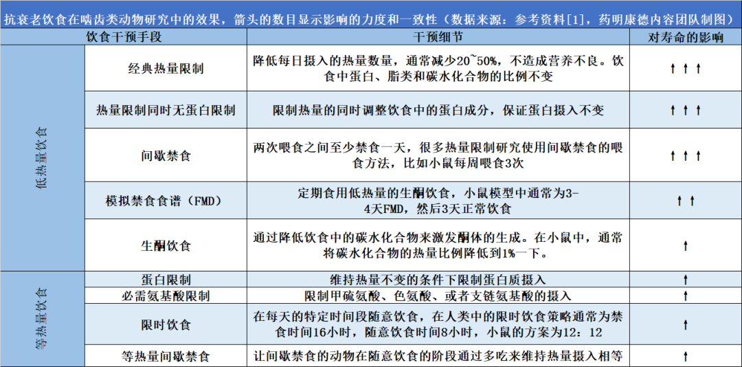 对科学文献的综合评估显示,在啮齿类动物(主要为大鼠和小鼠)的研究中,多个实验显示,这些饮食干预手段都或多或少地对延长动物寿命起到积极的作用。具体信息请见下面的表格,总体来看,低热量饮食对延长动物寿命的影响要高于热量等同饮食的影响。