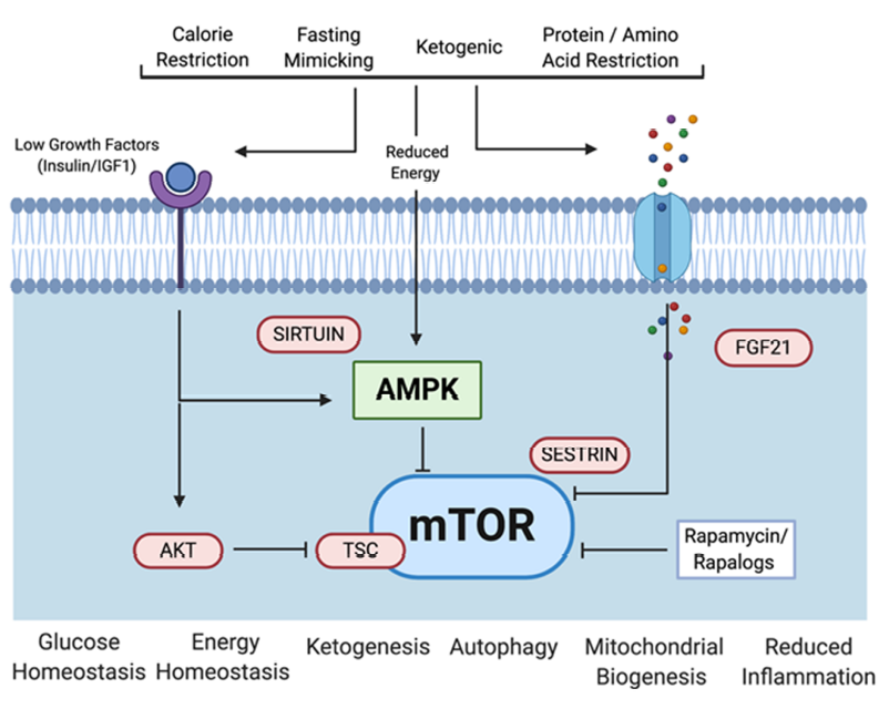 mTOR蛋白是一个介导对营养反应的蛋白激酶,它通过mTORC1和mTORC2两种不同的复合体起作用。mTOR受到关注的原因是在多种模式动物中抑制它的活性就能够模拟限制热量摄入对动物寿命的影响。越来越多的证据显示,本文中提到的多种抗衰老饮食都可以直接或者间接地抑制mTORC1信号传导。而且抑制mTORC1具有激活自噬作用、抑制mRNA转译、增强线粒体功能、改善干细胞功能、降低衰老相关炎症等多种有利于延长寿命的生理过程。