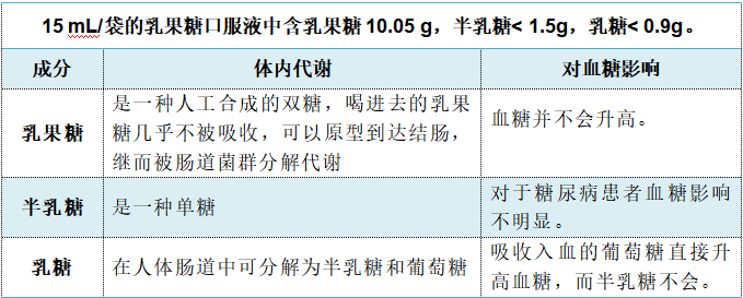 上表可以看出,乳果糖确实不会影响血糖,但乳果糖口服溶液里的辅料乳糖可分解代谢为半乳糖和葡萄糖,而葡萄糖能吸收入血直接升高血糖。乳果糖口服溶液中含有的可吸收糖含量很小(治疗便秘的常规剂量:一般成人起始剂量每日30ml(含乳糖≤1.8克),维持剂量每日10-25ml(含乳糖≤0.6-1.5克),喝进去30ml大概只有两口米饭的热量),不会对糖尿病患者的血糖造成很大影响,糖尿病患者是可以安全使用乳果糖来缓解便秘的。