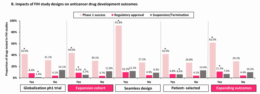 一般而言,在FIH研究中采用创新设计与更高的I期成功率和更高的批准率相关。特别是,增加扩展队列 (p=0.020) 并将主要终点扩展到包括疗效评估 (p=0.021) 的 FIH 研究与显著更高的药物批准率相关。暂停和/或终止率方面,在采用全球多中心设置 (p< 0.001)、增加扩展队列 (p=0.047) 和使用患者选择策略 (p<0.001) 的FIH研究中,研究药物较小概率在临床开发过程中被暂停和/或终止。