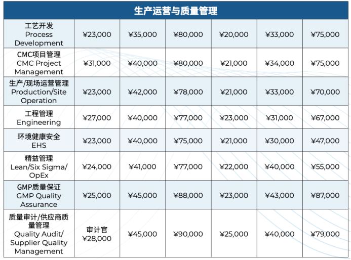 报告显示,在医药与生物科技领域的综合管理职位,外资公司/大型内资集团比中小型公司约高出2万元左右。对于首席科学官(CSO)职位的月薪,外资公司/大型内资集团在20万元~43.8万元,中小型公司在18.8万元~31.3万元;首席医学官(CMO)职位的月薪,外资公司/大型内资集团在15万元~38万元,中小型公司在12万元~25万元;首席运营官(COO)的月薪,外资公司/大型内资集团在14.2万元~24.2万元,中小型公司在12.5万元~22.1万元;首席质量官(CQO)的月薪,外资公司/大型内资集团在13.8万元~35.8万元,中小型公司在18万元~25万元;厂长的月薪,外资公司/大型内资集团在8.5万元~18万元,中小型公司在8.3万元~17万元。