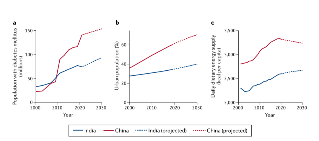 ▲印度和中国糖尿病疾病负担,a图:2000年至2030年印度/中国20~79岁糖尿病患者预估数量;b图:2000年至2030年印度/中国城市地区糖尿病患者占比;2000年至2030年印度/中国人群预估平均每日膳食能量(图片来源:参考资料[1])