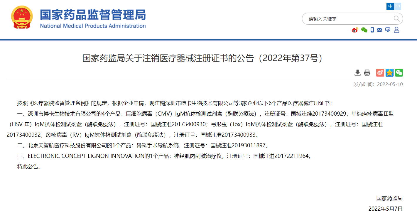 2022年5月10日,国家药品监督管理局官网发布关于注销医疗器械注册证书的公告(2022年第37号),公告显示,深圳市博卡生物技术有限公司等3家企业的6个产品医疗器械注册证书被注销。