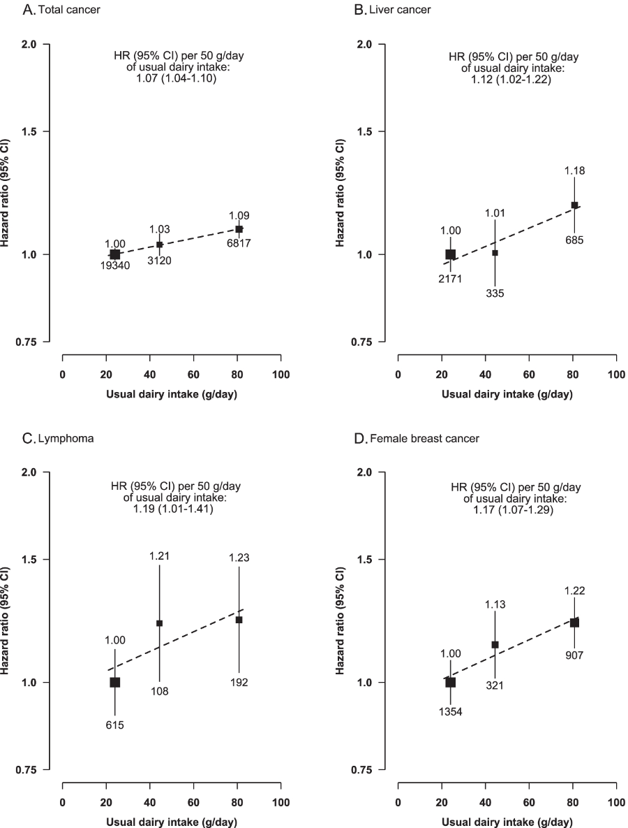 此外,乳制品摄入量每天增加50克,相对应的总癌症、肝癌、淋巴瘤、女性乳腺癌风险分别增加7%、12%、19%和17%。不过,本研究尚未发现乳制品摄入量与结直肠癌、胃癌或其他特定部位癌症发病风险的相关性。