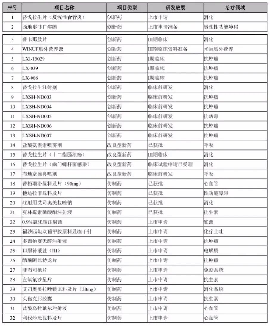 抗肿瘤研发管线共有9个项目,两款仿制药处于上市申请审评阶段,7款创新药中3个处于临床早期阶段,4个处于临床前开发阶段。其中LX-086和LX-039差异性明显。