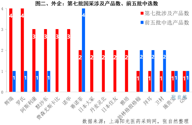 第七批国采共涉及外企46个原研产品,仅次于第三批的47个和第五批的58个。如以外企第五批的参与率和中选率来简单推测的话,外企在第七批将有42个产品报价、10个中选。当然要以最终结果为准,现只是推测。