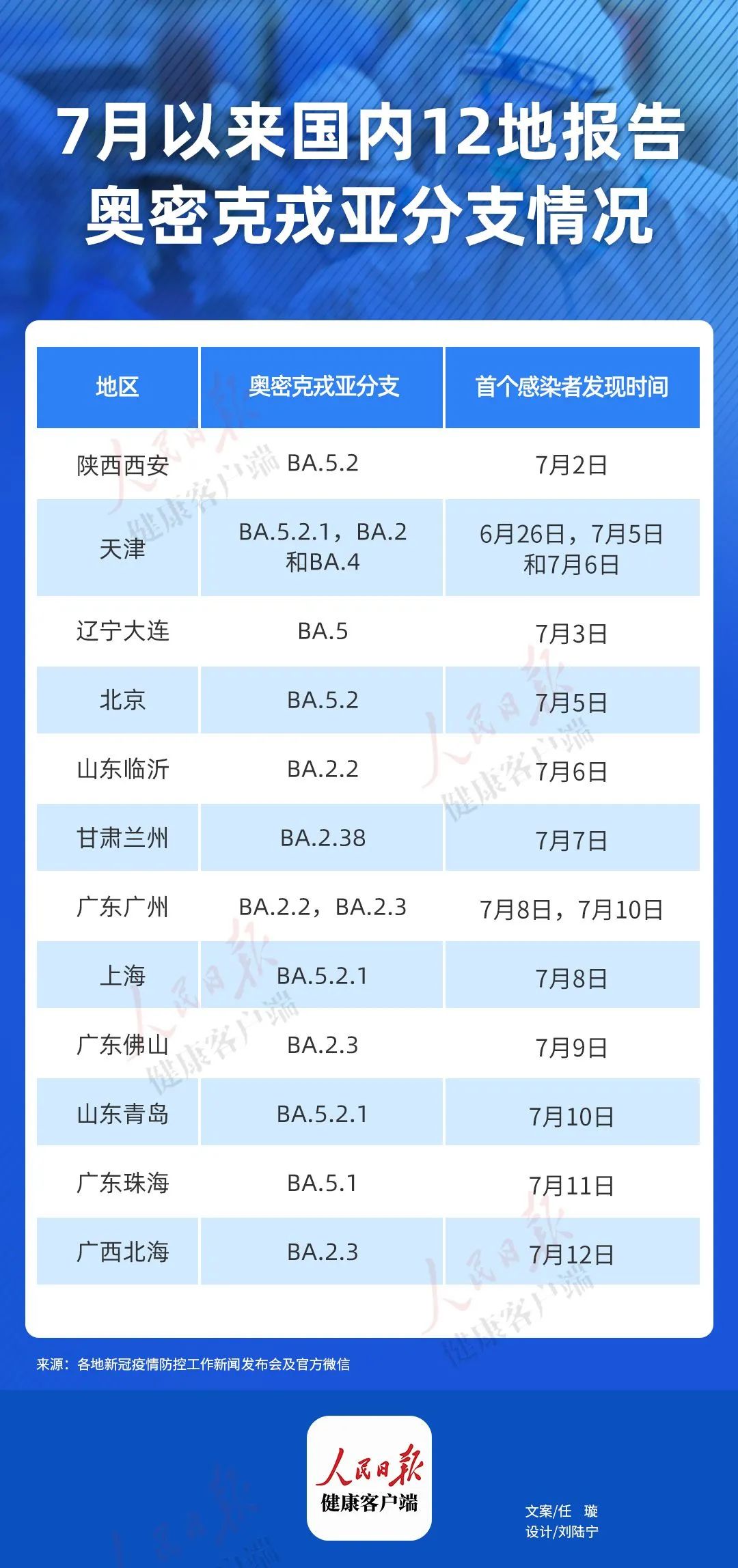 健康时报注意到,7月以来,内地各省(区)市本土感染者基因测序通报了各奥密克戎亚分支。其中,辽宁大连报告发现BA.5,陕西西安、北京报告发现BA.5.2,广东珠海报告发现BA.5.1,天津、上海、山东青岛报告发现BA.5.2.1;此外,还有多地报告发现了BA.4、BA.2.2,BA.2.3,BA.2.38等奥密克戎毒株亚分支。