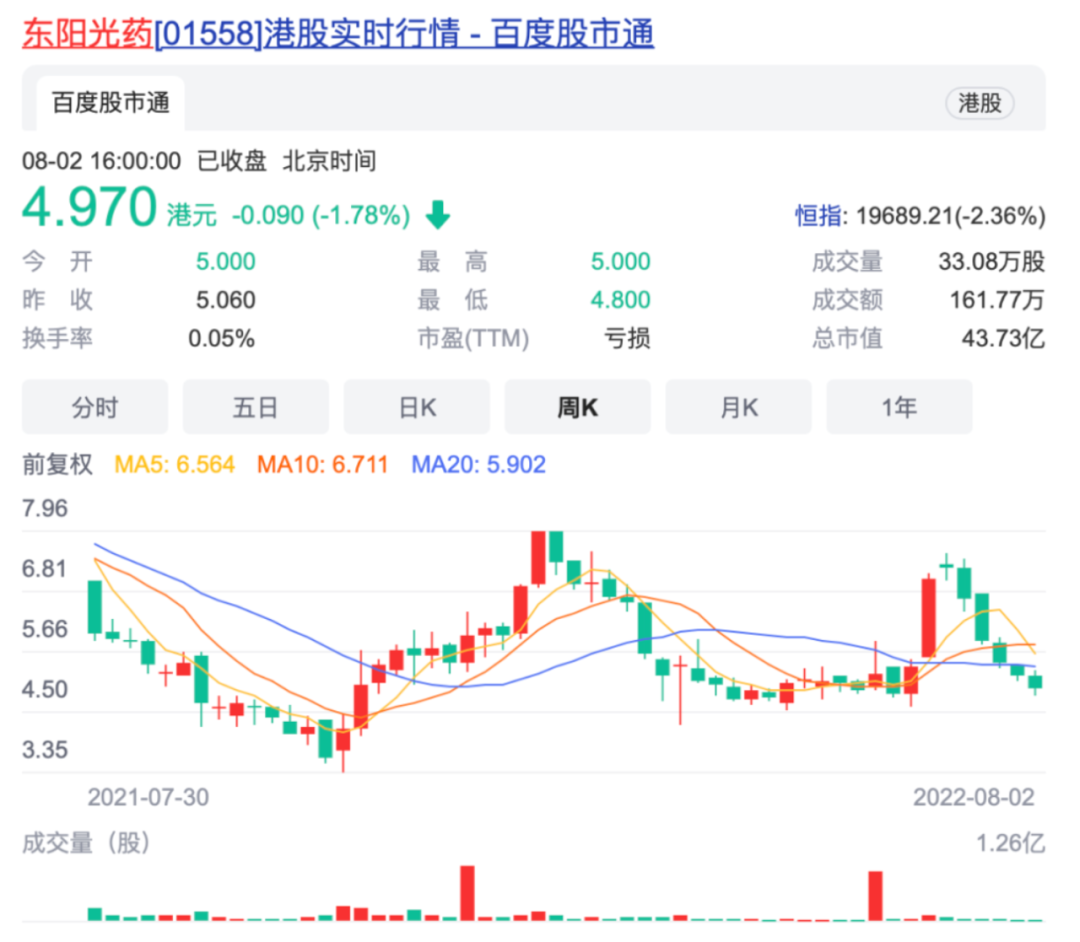 要知道,2019年,可威胶囊的销售额曾高达16.6亿元,即使在销售最差的2021年,其营收也有8511万元。此次集采得到的份额,尚不及2021年的营收零头。很快,资本市场对于“一品独大”的东阳光药做出反应,刚刚站上7港元没几天的东阳光药,股价眨眼又跌回5港元。