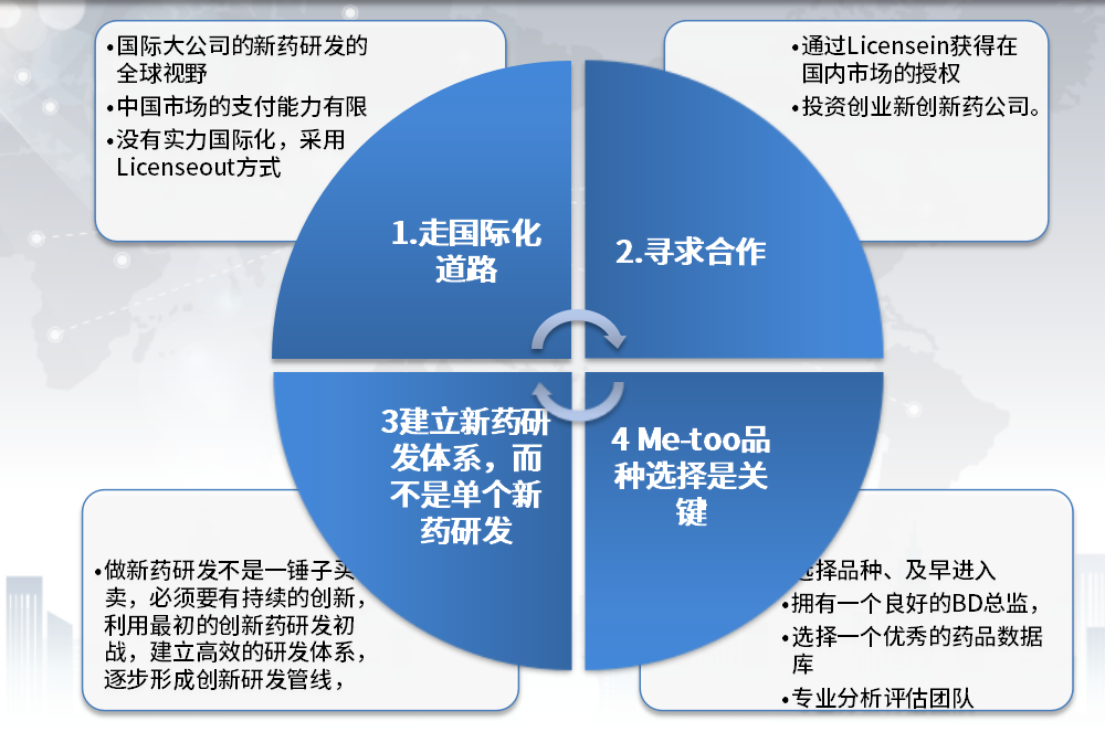 药智网联合创始人李天泉提出四个方向:一是走国际化道路,尽管目前创新药出海屡屡受挫,但在中国市场支付能力有限的情况下,以国际化大公司新药研发的全球视野,开发具有原创性新药“Firstinclass”的产品,扩大市场,提升,寻求更丰厚的回报,良性循环,才有更多的资金进行研发;如果没有国际化的实力,采用License out方式,借助国外企业换种方式国际化。