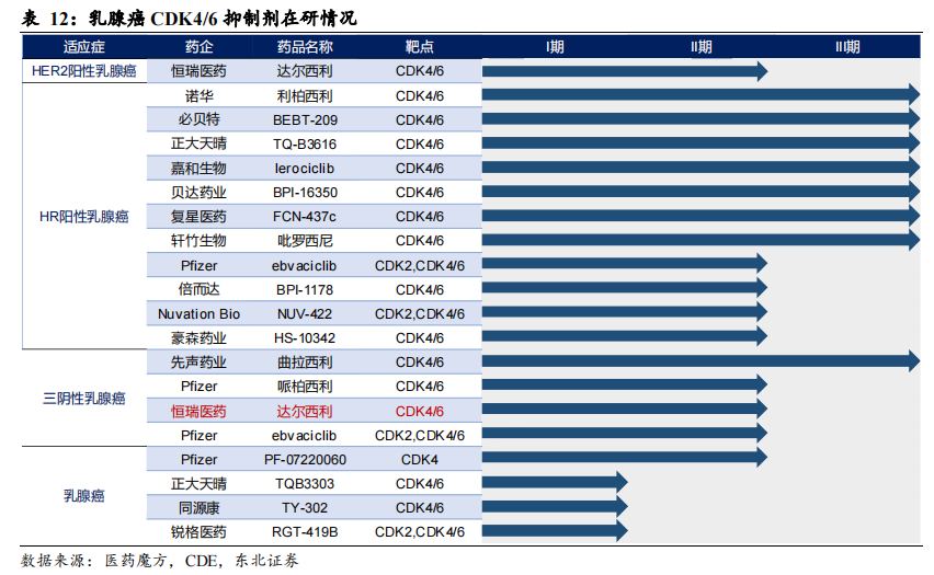 另外,国内还有至少9款乳腺癌CDK4/6抑制剂处于临床Ⅱ期阶段,涉及的药企包括恒瑞医药、辉瑞、豪森药业等。