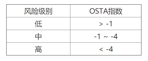 计算OSTA指数,即(体重公斤数-年龄)×0.2,大于-1代表较低风险;-1至-4之间,表示骨质疏松症为中风险;小于等于-1提示中高风险,建议做进一步骨密度测量等(绝经后人群适用)。在无骨密度测定情况下,高风险可考虑抗骨质疏松治疗。