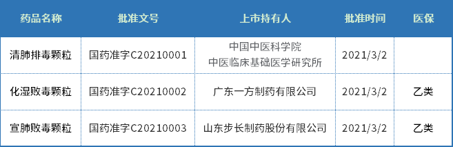 这三个批文都是国家药监局在新冠疫情期间通过特殊审批程序批准的药物,用于治疗新冠肺炎,如化湿败毒颗粒的功能主治为“化湿解毒,宣肺泄热。用于湿毒侵肺所致的疫病……”,这也是按照《中药注册分类及申报资料要求》“3.2类:其他来源于古代经典名方的中药复方制剂”首次审批通过的品种。