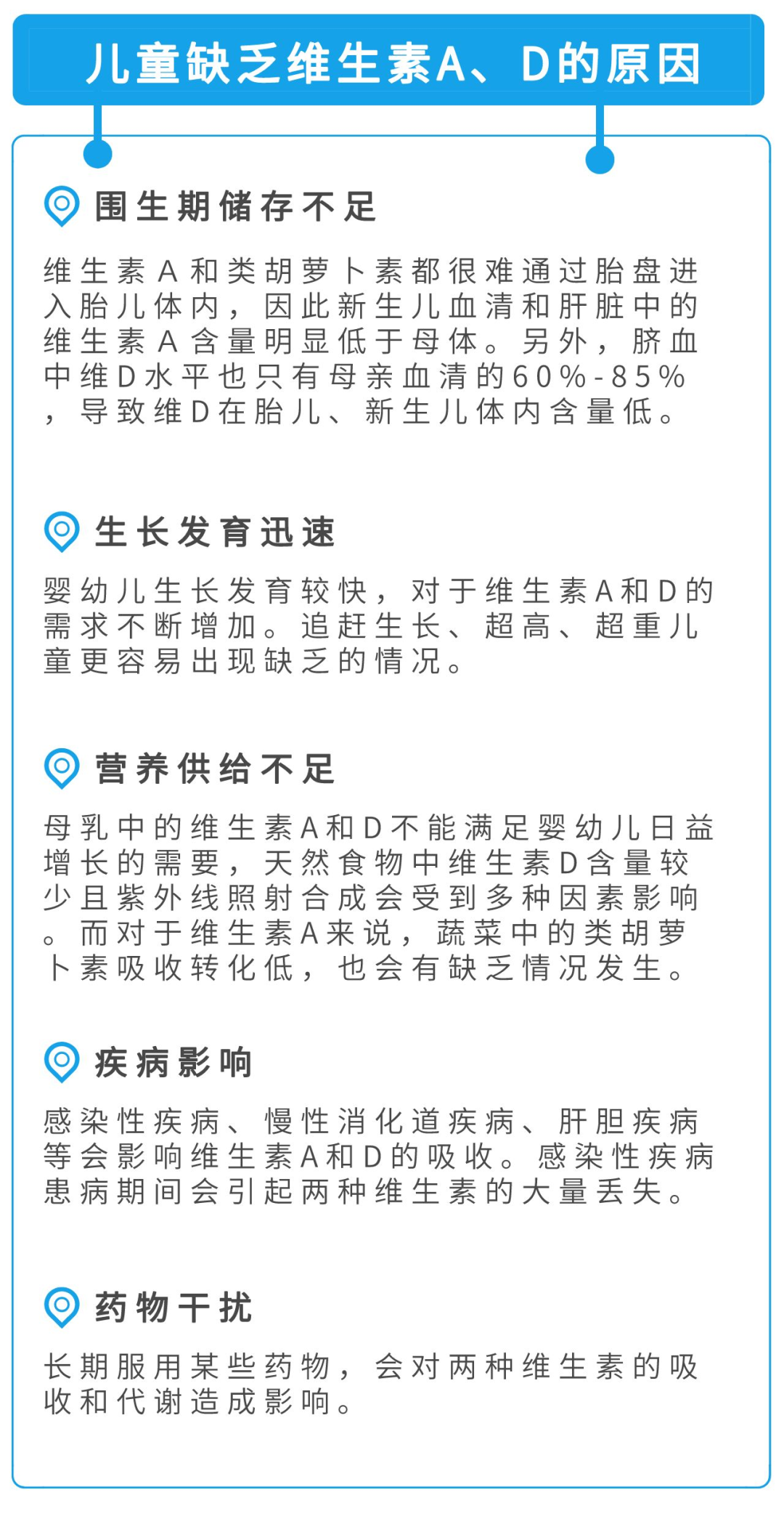 但由于围生期储存不足、孩子生长发育迅速以及营养供应不足、天然食物含量少、紫外线光照有限等因素,我国儿童维生素A和D整体营养水平未达标,按照规范服用维生素A和D的补充制剂,有助于改善状况,降低缺乏风险,促进儿童早期发展。