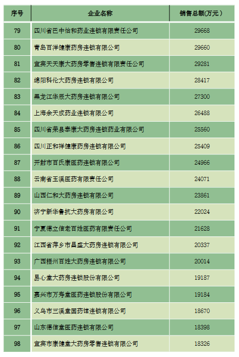 2021年药品零售企业销售总额前10位分别是:国药控股国大药房、大参林医药集团、老百姓大药房连锁、益丰大药房连锁、一心堂药业集团、中国北京同仁堂(集团)、上海华氏大药房、漱玉平民大药房连锁、云南健之佳健康连锁店、甘肃众友健康医药(全部名单见文末“附件”)。