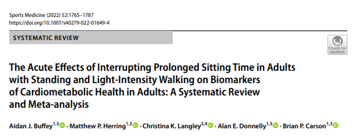 [1]Buffey AJ, Herring MP, Langley CK, et al. The Acute Effects of Interrupting Prolonged Sitting Time in Adults with Standing and Light-Intensity Walking on Biomarkers of Cardiometabolic Health in Adults: A Systematic Review and Meta-analysis. Sports Med. 2022 Aug;52(8):1765-1787. doi: 10.1007/s40279-022-01649-4. Epub 2022 Feb 11. PMID: 35147898; PMCID: PMC9325803.