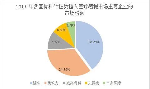 但具体到市场占有率品牌来看,与其他高值耗材情况一样,进口品牌依然占据了主导地位。根据此前威高骨科发布的招股书显示,在2019年的国内脊柱类植入医疗器械细分市场中,强生、美敦力、威高骨科、史赛克、三友医疗这五家企业的市场份额分别是28.29%、24.39%、7.92%、6.50%、3.79%。可以看到强生和美敦力的市场份额比国产品牌威高骨科和三友医疗高了若干倍。