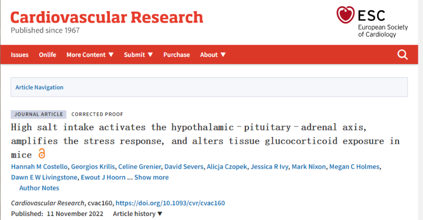 [1] Costello HM, Krilis G, Grenier C, et al. High salt intake activates the hypothalamic-pituitary-adrenal axis, amplifies the stress response, and alters tissue glucocorticoid exposure in mice [published online ahead of print, 2022 Nov 11]. Cardiovasc Res. 2022;cvac160. doi:10.1093/cvr/cvac160