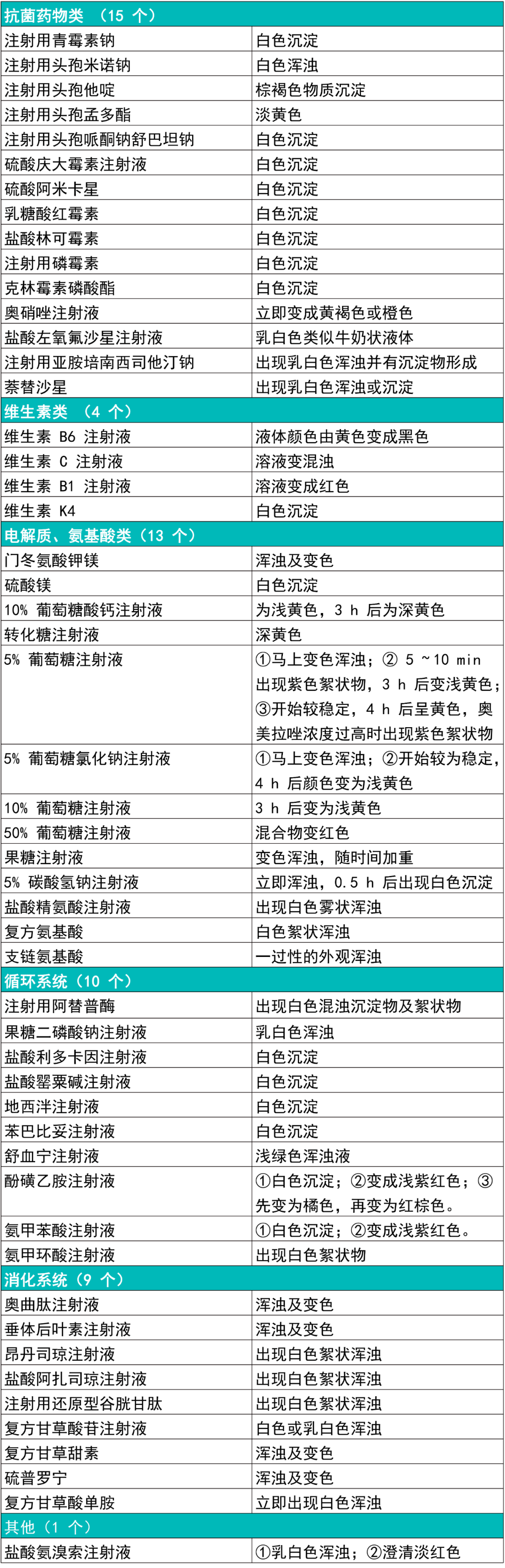 因此,回到开头的案例,奥美拉唑避免与酸性药物和溶媒配伍,而头孢哌酮钠舒巴坦钠的 pH 3.5 ~ 6.5,为酸性药物。在接瓶输注时,注意在两组液体之间加用一组 0.9% 生理盐水进行冲管。