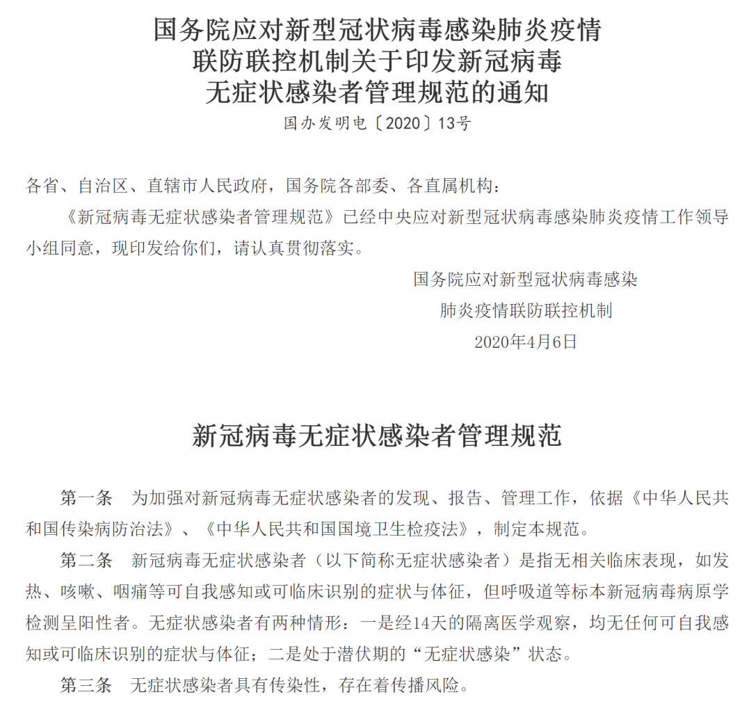 事实上,2020 年 4 月 6 日,国务院应对新型冠状病毒感染肺炎联防联控机制发文,曾明确「无症状感染者」是指:无相关临床表现,如发热、咳嗽、咽痛等可自我感知或可临床识别的症状与体征,但呼吸道等标本新冠病毒病原学检测呈阳性的患者,且至今各版本防控方案均沿用这一定义。
