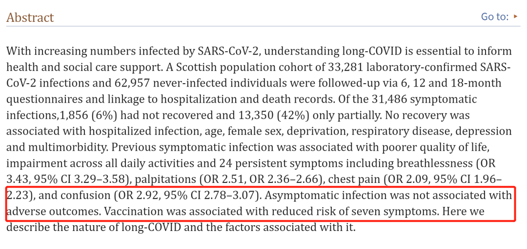 对于人们十分担心的后遗症问题,同样有研究聚焦在了无症状感染人群。今年 6 月,The Lancet 发表了一项研究提示奥密克戎毒株后遗症发生率仅是 Delta 毒株的 24~50%(接种疫苗的情况下)[10]。10 月 12 日,英国研究人员在 Nature Communications 发表题为 「Outcomes among confirmed cases and a matched comparison group in the Long-COVID in Scotland study」的研究则对 33281 名新冠感染者、62957 名对照组(从未感染新冠)进行分析,肯定新冠后遗症状对于患者的影响,提出发生后遗症状的可能性与感染的严重程度有关,并且得到「无症状感染者没有后遗症」(Asymptomatic infection was not associated with adverse outcomes)的结论 [11]。