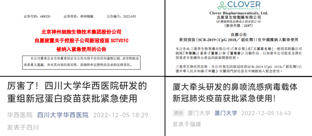 12 月 4 日下午 5 点,北京神州细胞生物技术对外公布,其公司研发的重组新冠病毒蛋白疫苗(SCTV01C)被纳入紧急使用。随后,四川大学华西医院、三叶草生物制药、厦门大学等纷纷宣布其研制的疫苗被纳入紧急使用。