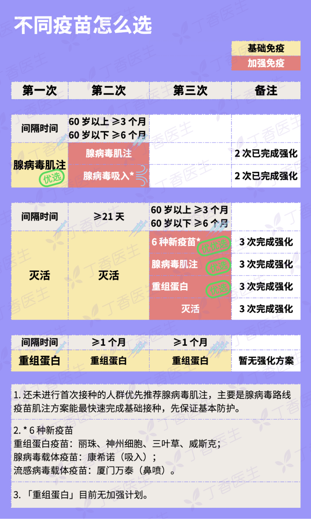 目前,非灭活疫苗的加强针免疫反应优于灭活疫苗,因此对于大部分以灭活疫苗完成基础免疫的人可以考虑用另一种基础路线的疫苗做加强。具体可以根据自己前几针所接种的类型,参照下图进行选择: