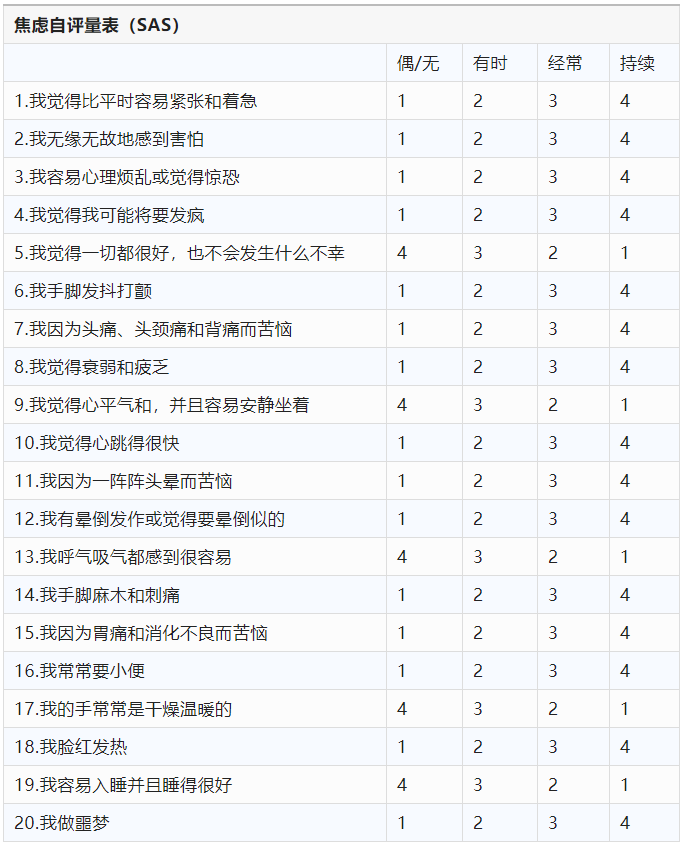 美国杜克大学编制了一份焦虑自评量表(SAS),可以帮你初步判断焦虑的轻重程度。